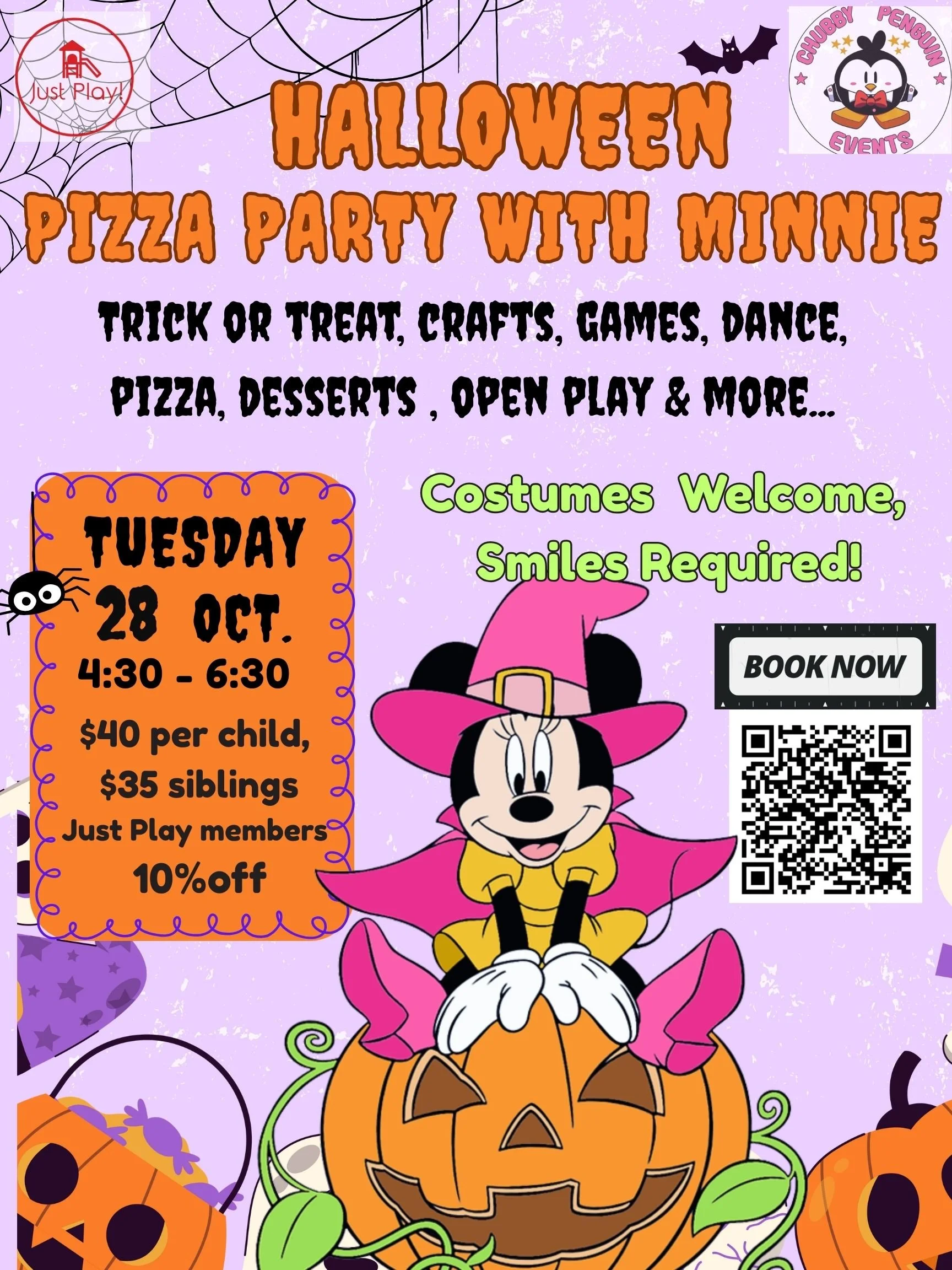 Wear your costume and Join to the Fun! Enjoy trick or treat, music, dancing and take a picture with Minnie!, do a Halloween craft, music, games, Pizza, desserts, bubbles and playtime are included!